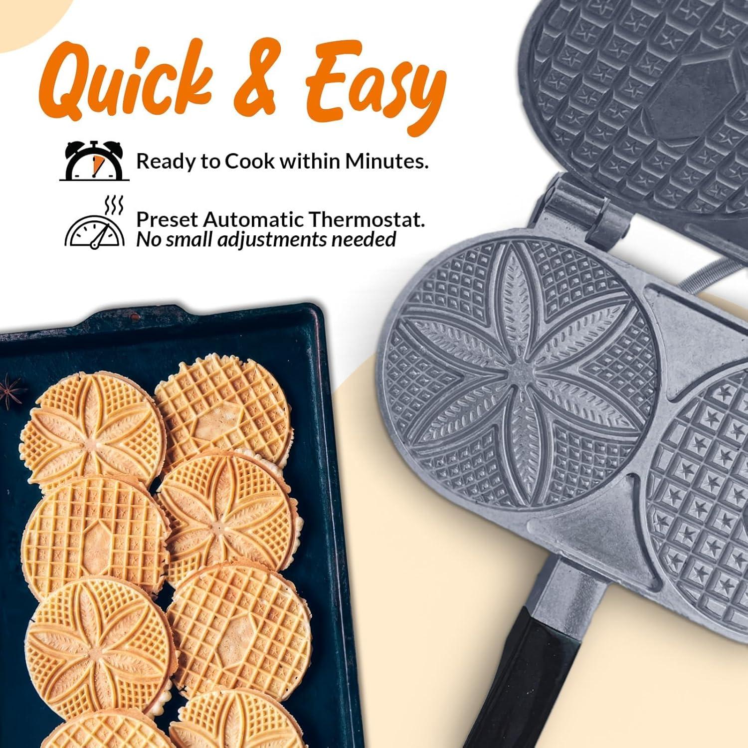 CONVENIENT & EASY TO CLEAN - Designed with user convenience in mind, this pizzelle iron is designed with clean up in mind. Its thoughtful design ensures you spend more time enjoying your delicious creations and less time on cleanup