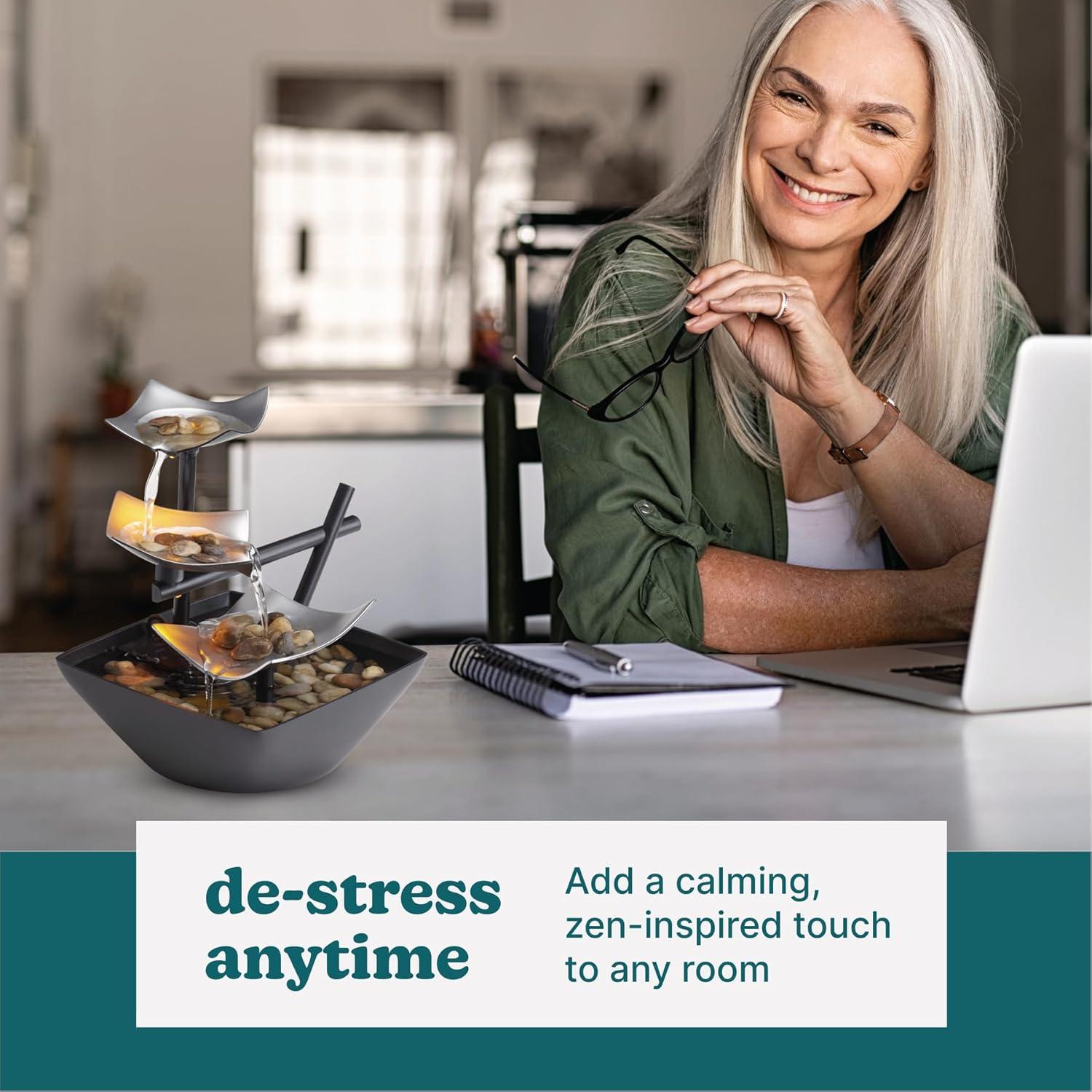 Decorative Tabletop Fountain: Showcase EnviraScape’s Silver Springs Relaxation Fountain on Display to bring a calming, Zen feel to any room; It is just the right size to add a Decorative accent to any Tabletop, bathroom sink, and vanity or Office desk; It Features a 3 tiered Waterfall, natural stones, and a Large basin; The tiers create several streams of Water creating a Gentle Soothing sound of Water; The Water flow replicates the sights and Sounds of a tranquil spring