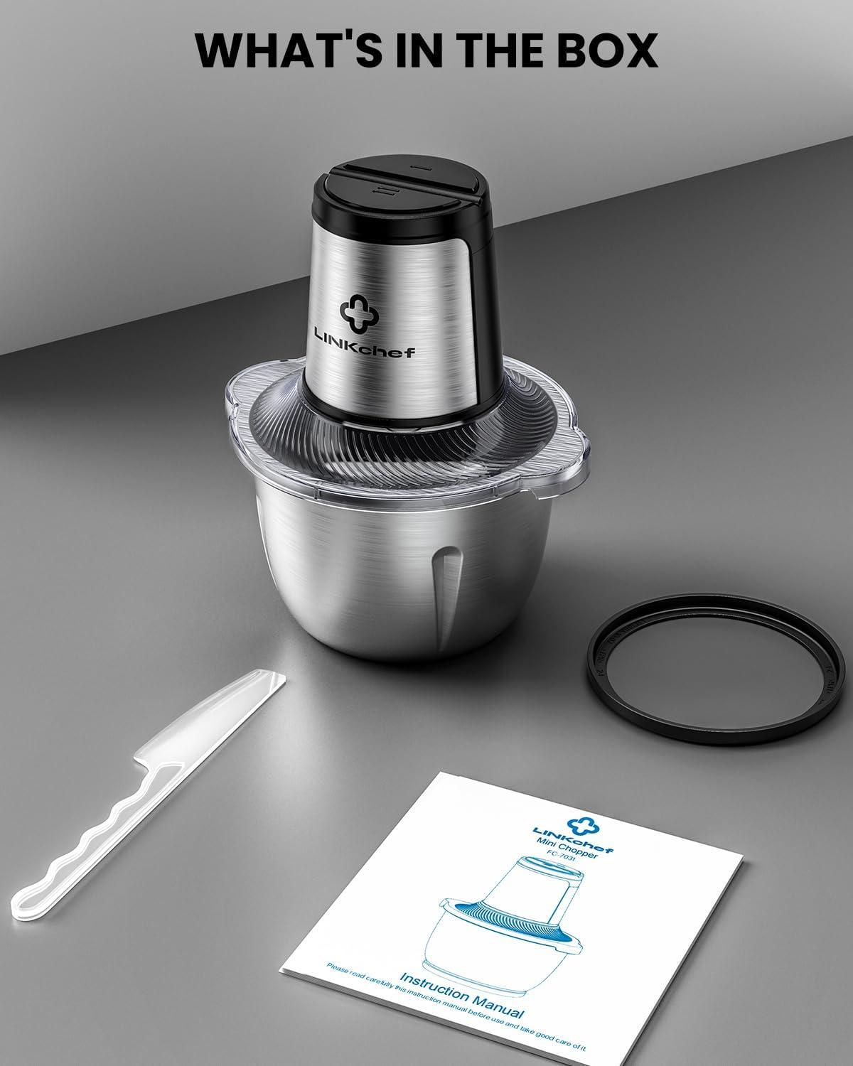 What You Get: LINKChef small chopper main body/power pod, S blades, stainless steel bowl, BPA 0 transparent lid, anti-slip rubber mat, user manual, our 7*24h friendly customer service