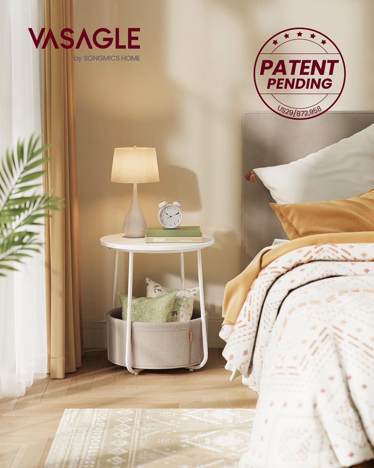 Modern & Simple: Add a touch of style to your living room or bedroom with this simple round end table featuring a linen-like basket—easy to match with your furniture